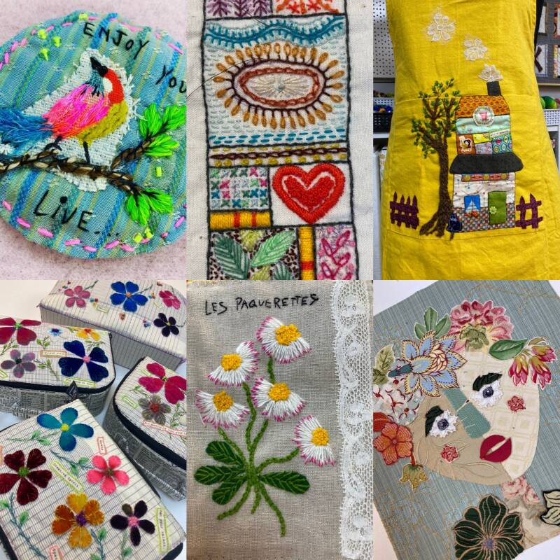 Cours de broderie où tout le monde réalise le même projet. Ouvert à tous les niveaux, débutantes comme plus expérimentées.